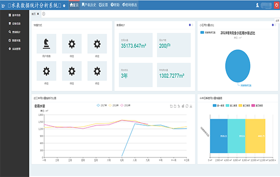 在首页上就可以方便的查看总用水量、总用户数、近三年用水量趋势图、小区用水量占比、今年四季度用水量堆叠图等。